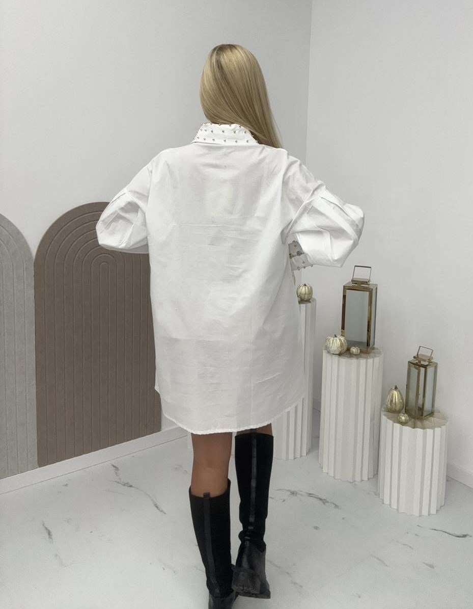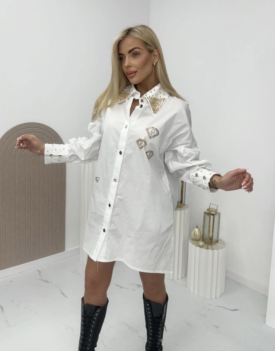 Koszula popelinowa zapinaną na guziki. Zdobienia w postaci złotych kuleczek.
