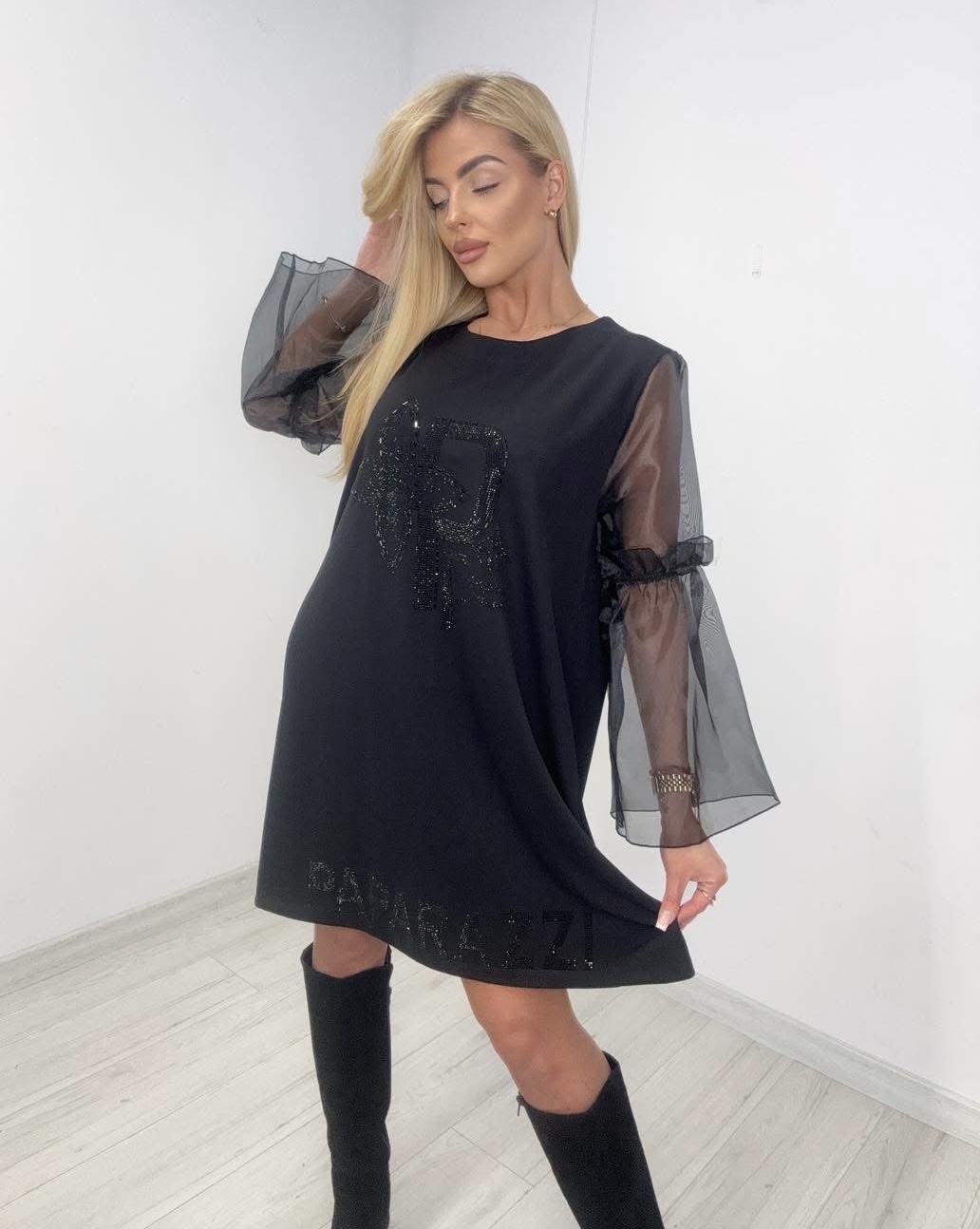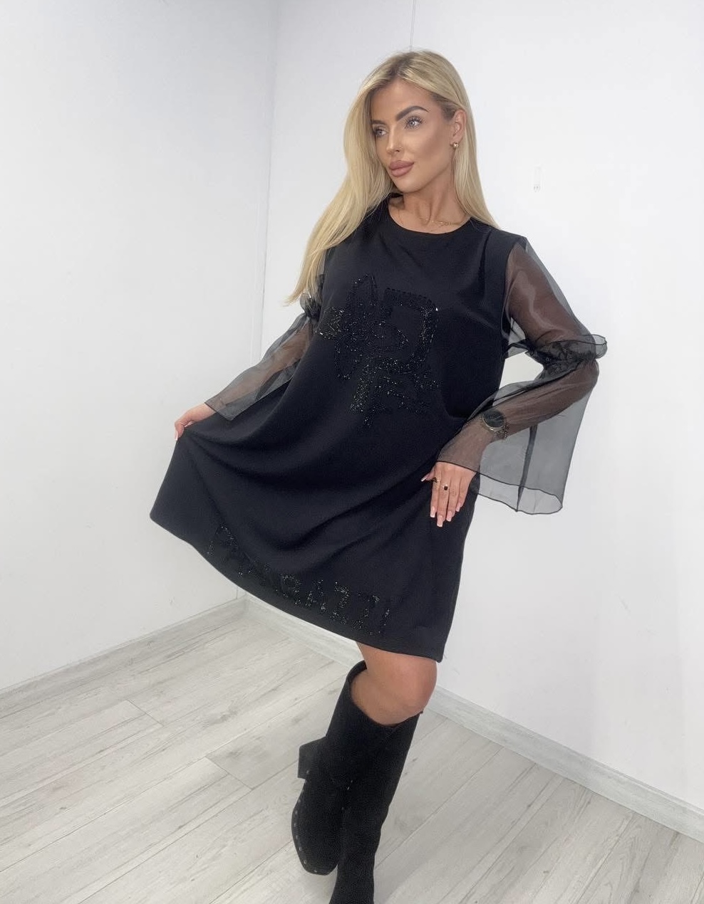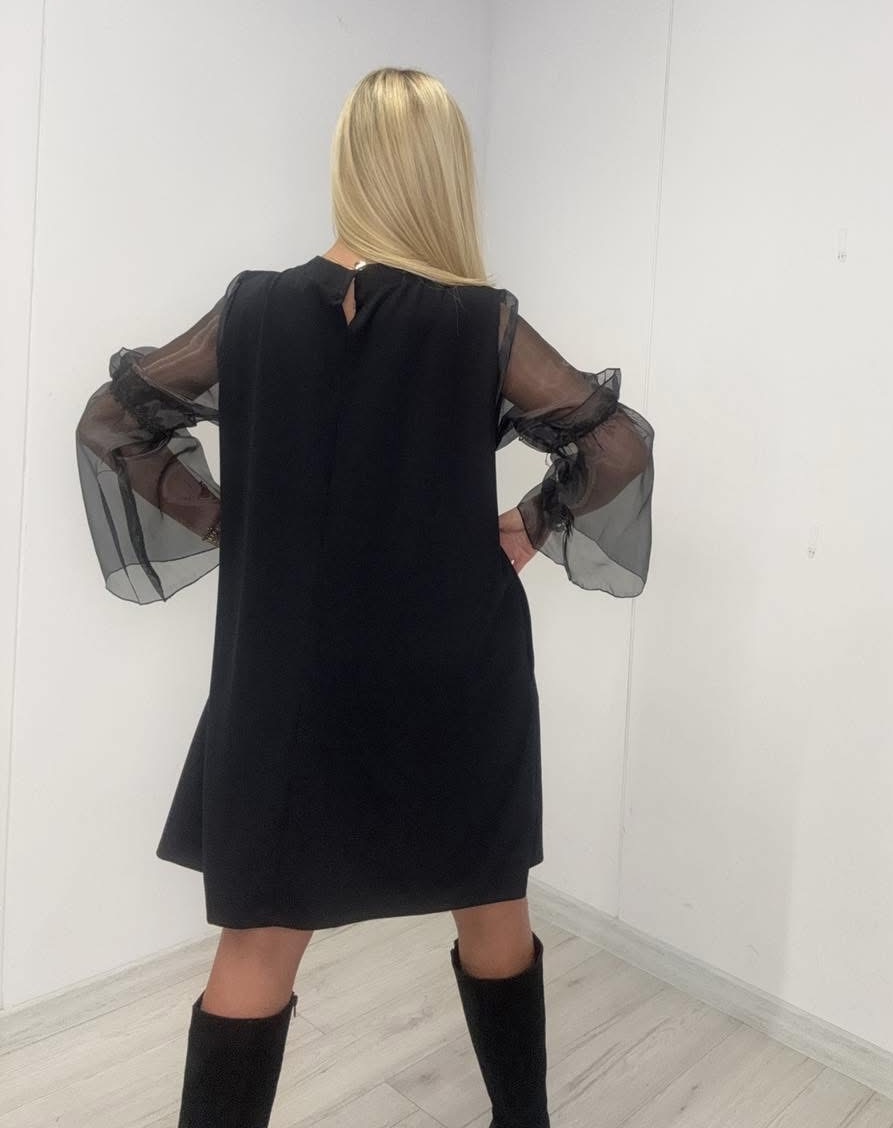 Elegancka sukienka z rękawem z tiulu.