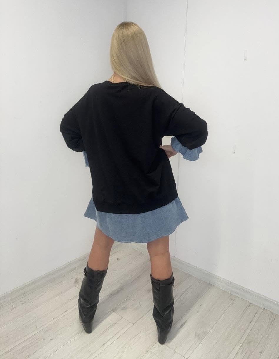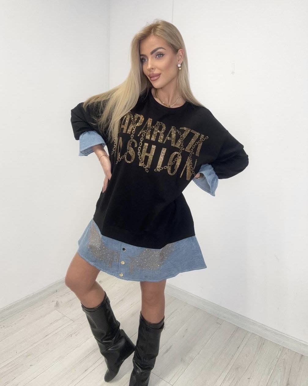 Sukienka dresowa ( bawełniana) łączona z dżinsem i zdobiona cyrkoniami.