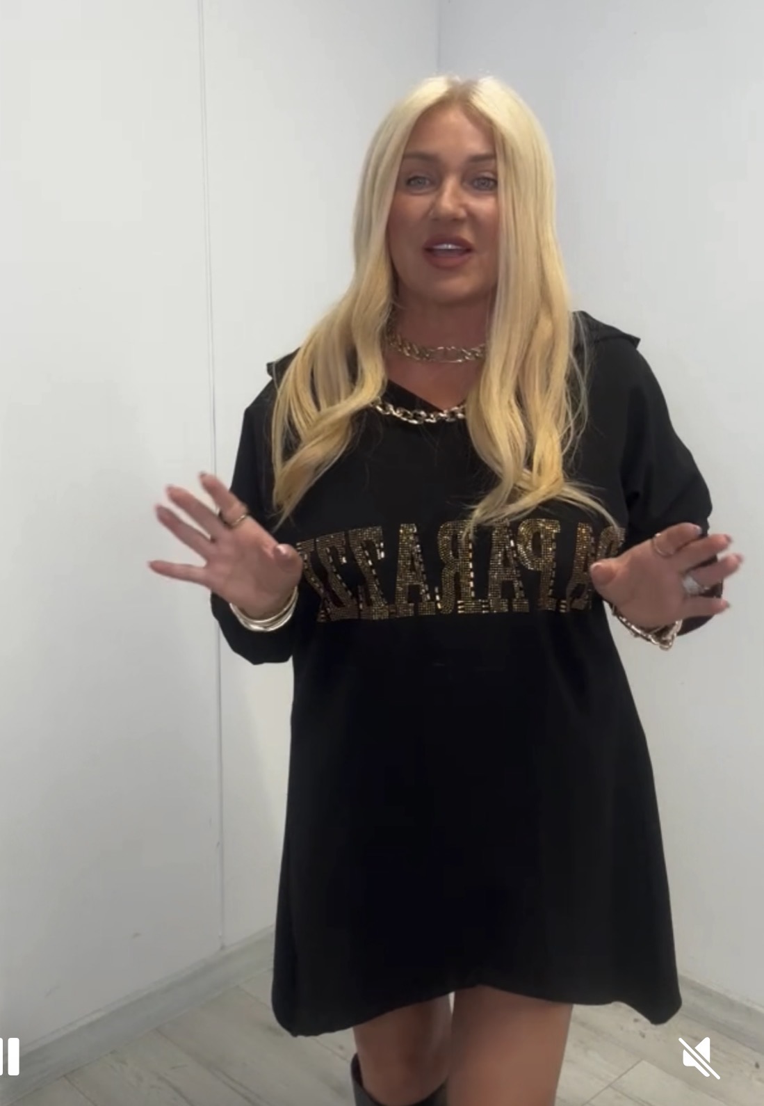 Modelka w rozmiarze S o wzroście 174 cm. Ma na sobie rozmiar uniwersalny.
