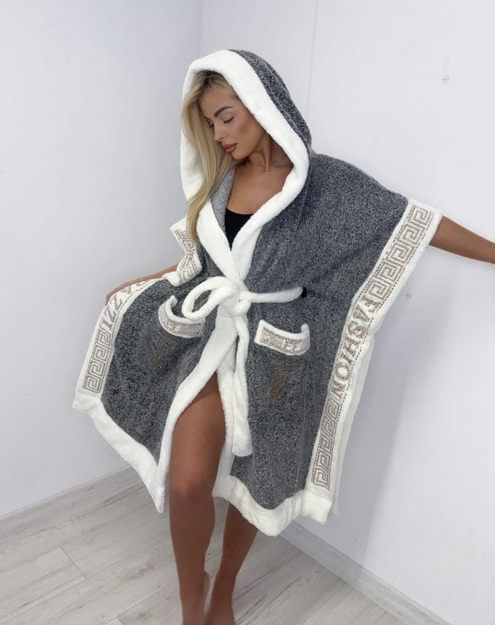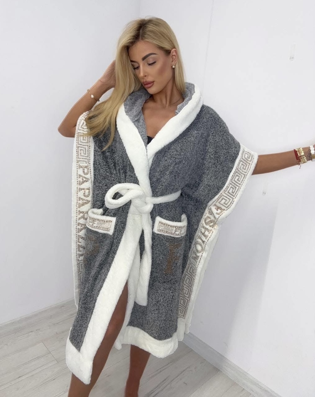 Przyjemny szlafrok przewiązywany paskiem i zdobiony cyrkoniami. Pokrowiec w zestawie.