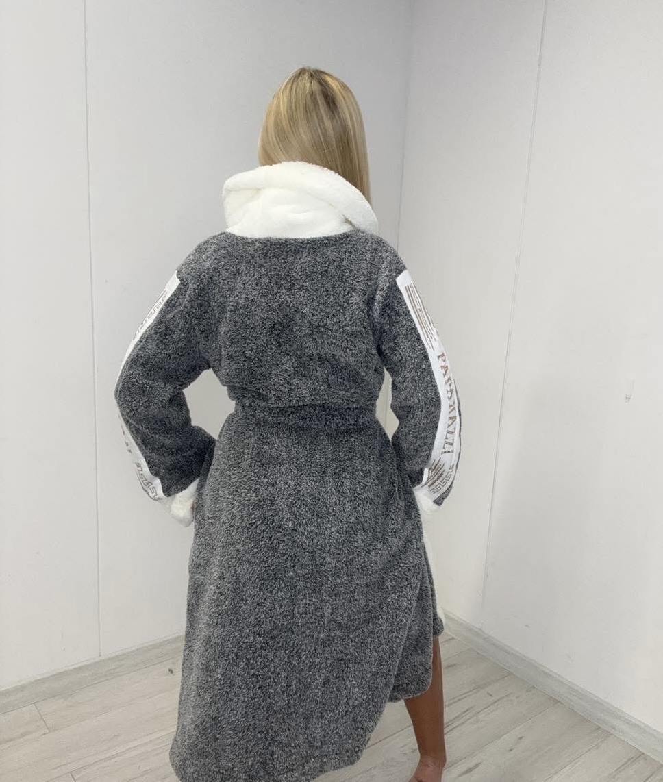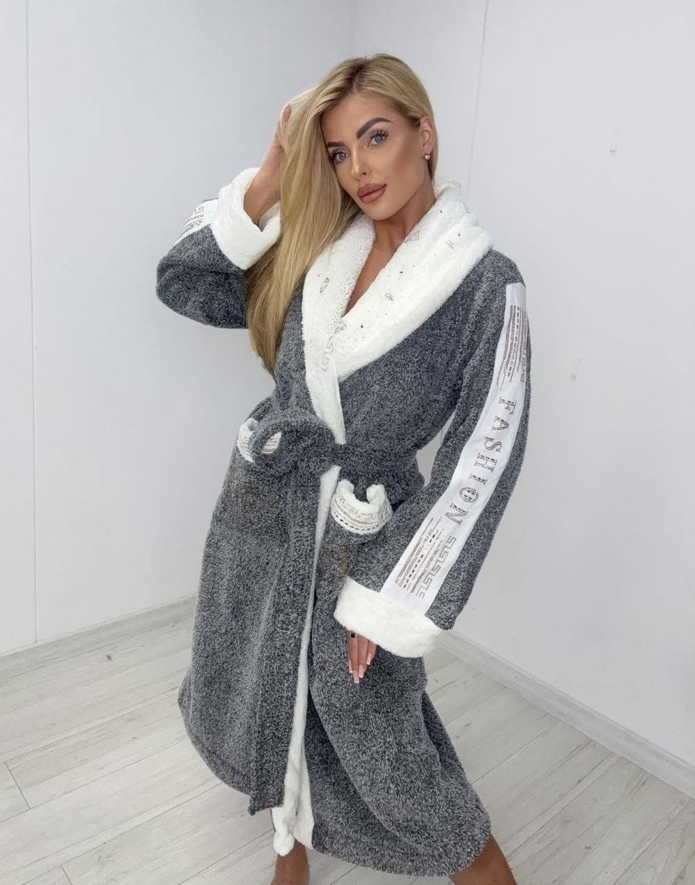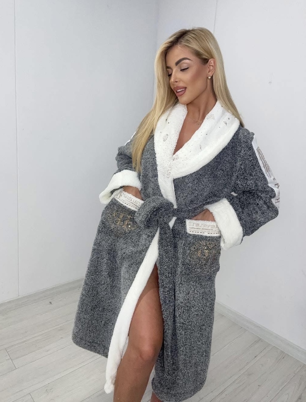 Przyjemny szlafrok przewiązywany paskiem i zdobiony cyrkoniami. Pokrowiec w zestawie.