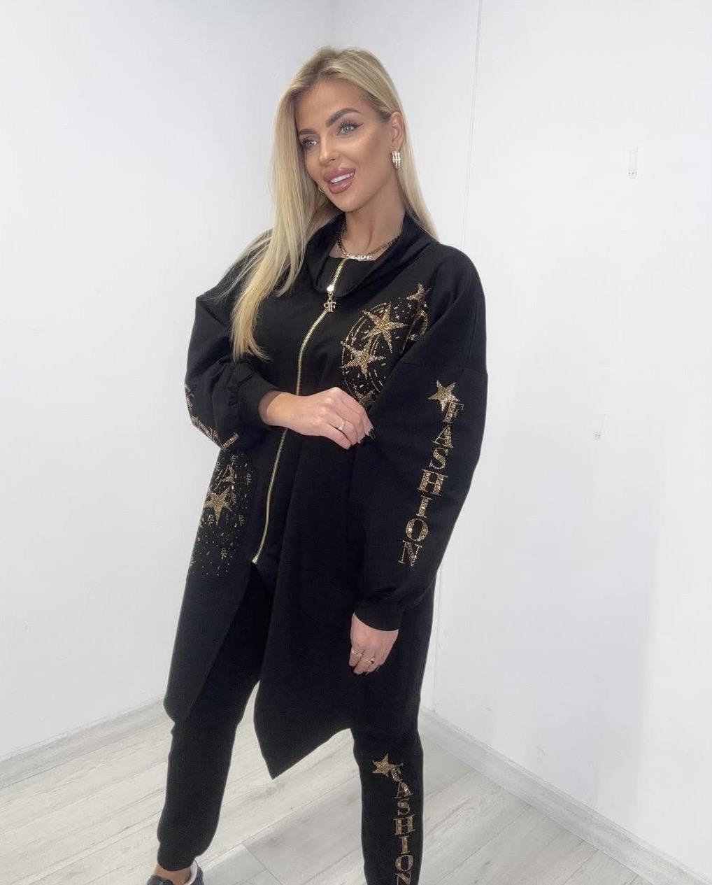 Modelka w rozmiarze S o wzroście 174 cm. Ma na sobie rozmiar uniwersalny.
