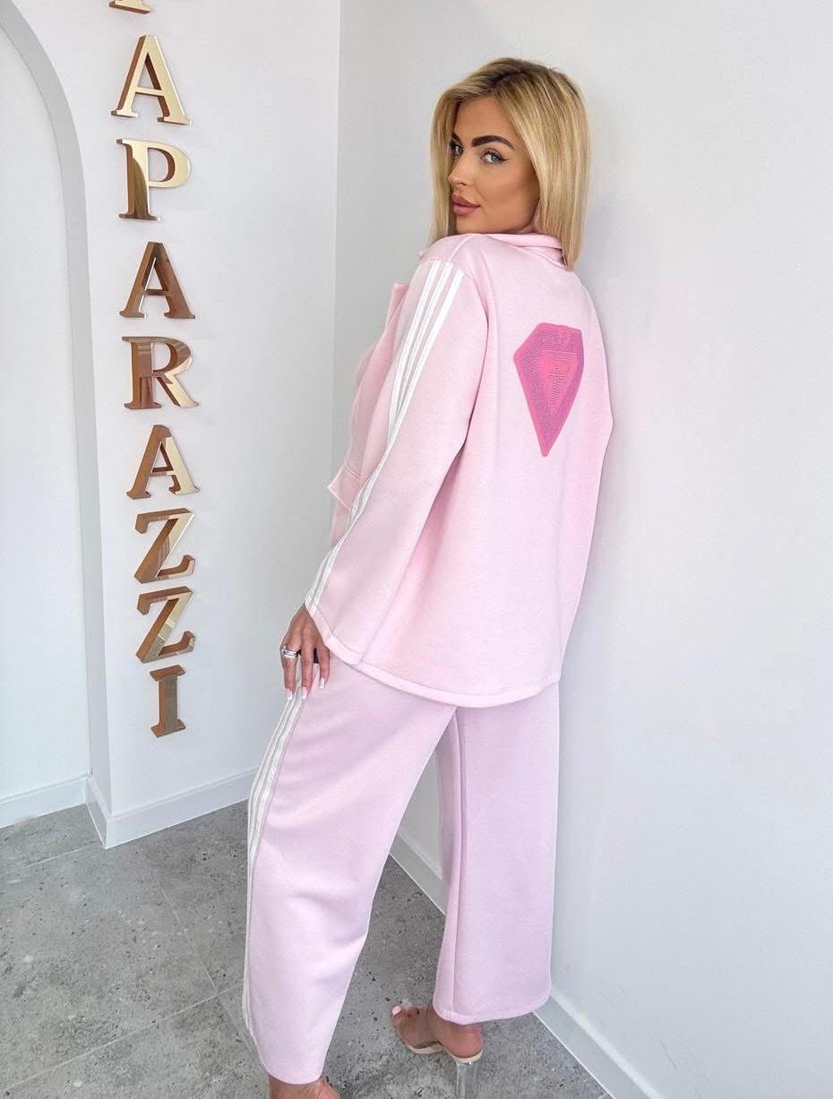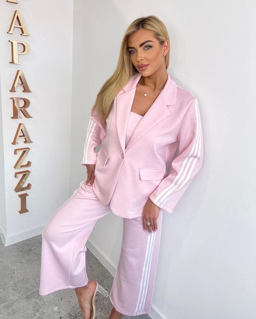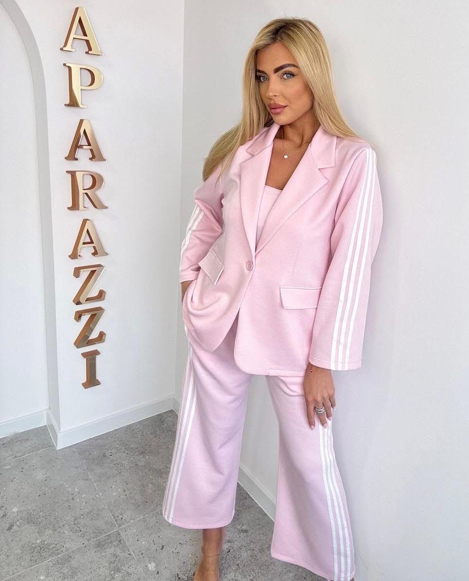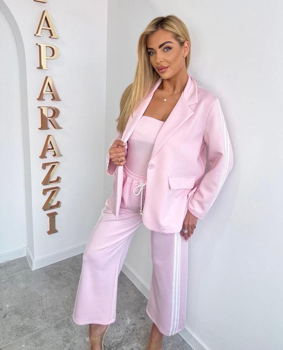 Stylowy komplet damski składający się z marynarki oraz spodni z elastyczną gumką w pasie.
